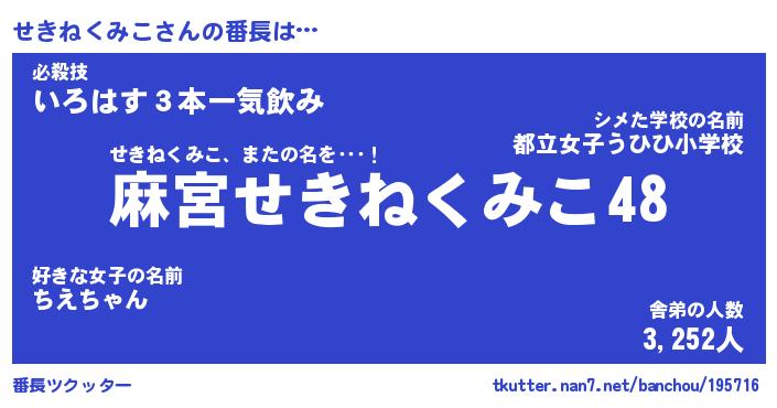 | ヒーロー風カッコイイあだ名 | 『スーパーセキネクミコ』『黄金騎士セキ』 |