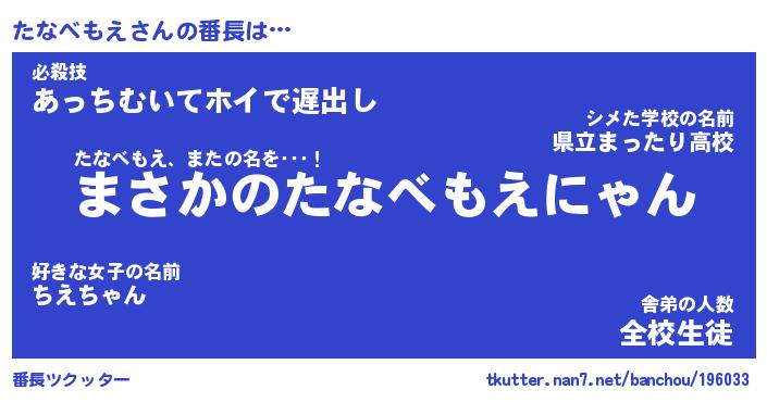 | 肩書あだ名 | 『たなべもえ店長』『たなべもえ国家主席』 |