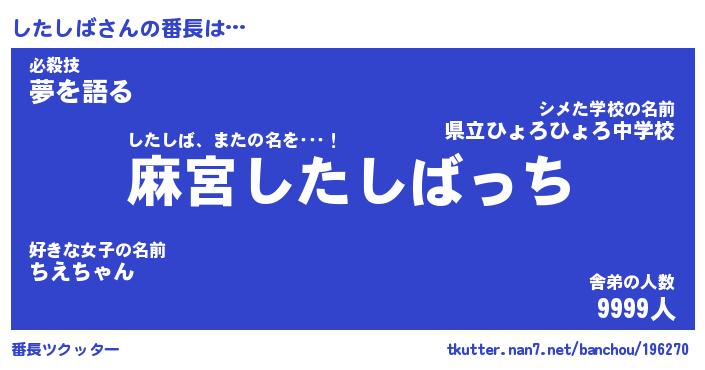 | ヒーロー風カッコイイあだ名 | 『スーパーシタシバ』『天弓騎士シタ』 |