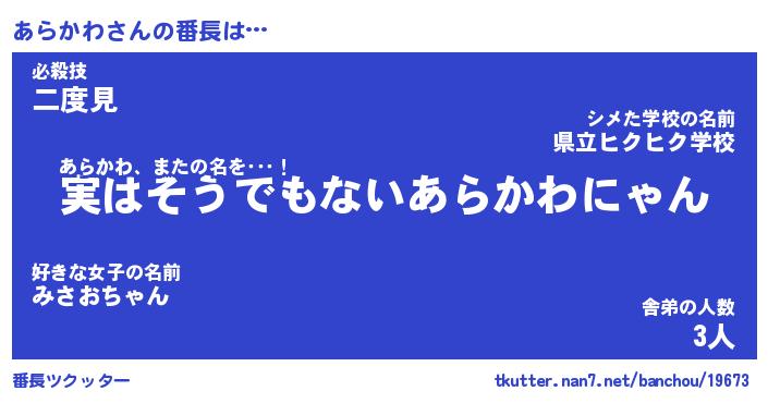 | 肩書あだ名 | 『あらかわ店長』『あらかわ総理大臣』 |