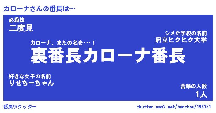 | 肩書あだ名 | 『カローナ店長』『カローナ総理大臣』 |
