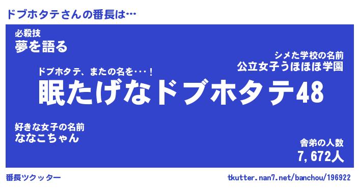| ヒーロー風カッコイイあだ名 | 『スーパードブホタテ』『炎刃騎士ドブ』 |