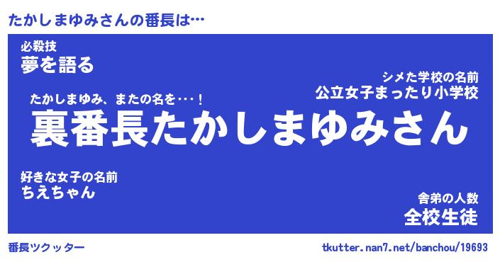 | 肩書あだ名 | 『たかしまゆみ社長』『たかしまゆみ班長』 |