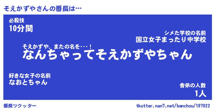 | 肩書あだ名 | 『そえかずや御曹司』『そえかずや班長』 |