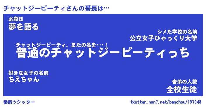 | 肩書あだ名 | 『チャットジーピーティ社長令嬢』 |