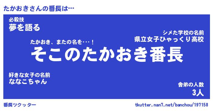 | ヒーロー風カッコイイあだ名 | 『スーパータカオキ』『魔戒騎士タカ』 |