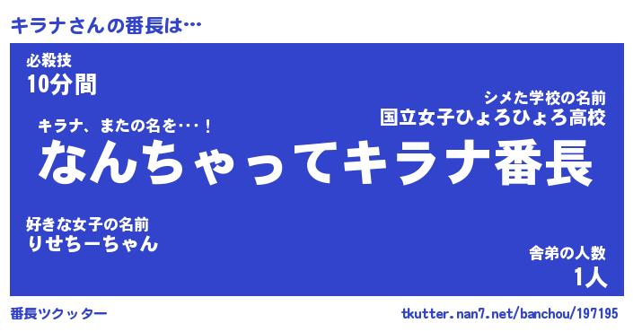 | ヒーロー風カッコイイあだ名 | 『スーパーキラナ』『ウルトラキラナマン』 |