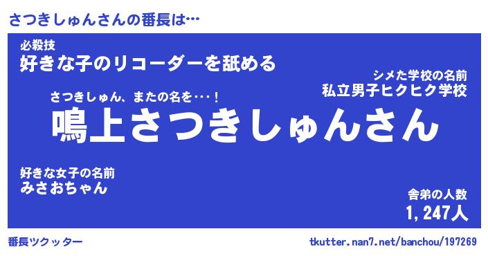 | 肩書あだ名 | 『さつきしゅん社長』『さつきしゅん班長』 |