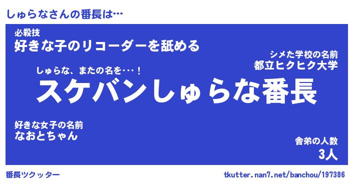 | 意味不明あだ名 | 『ペロリンしゅらな』『永久保存しゅらな』 |
