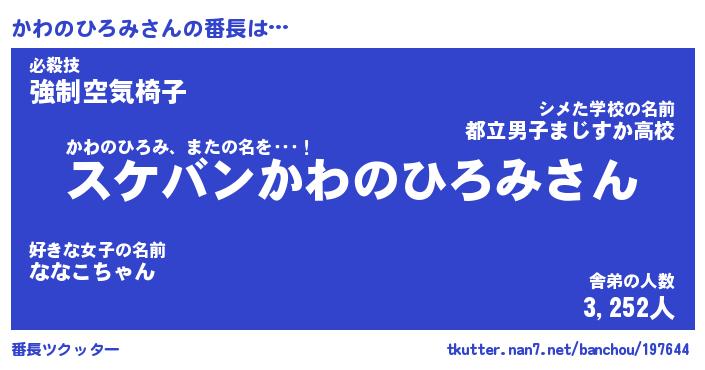| ヒーロー風カッコイイあだ名 | 『スーパーカワノヒロミ』『幻影騎士カワ』 |