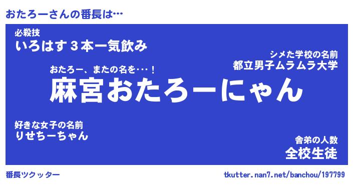 | 意味不明あだ名 | 『ペロリンおたろー』『永久保存おたろー』 |