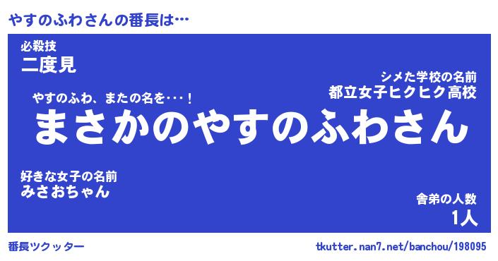 | ヒーロー風カッコイイあだ名 | 『スーパーヤスノフワ』『炎刃騎士ヤス』 |