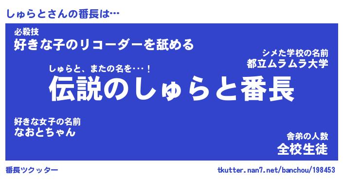 | 肩書あだ名 | 『しゅらと店長』『しゅらと国家主席』 |
