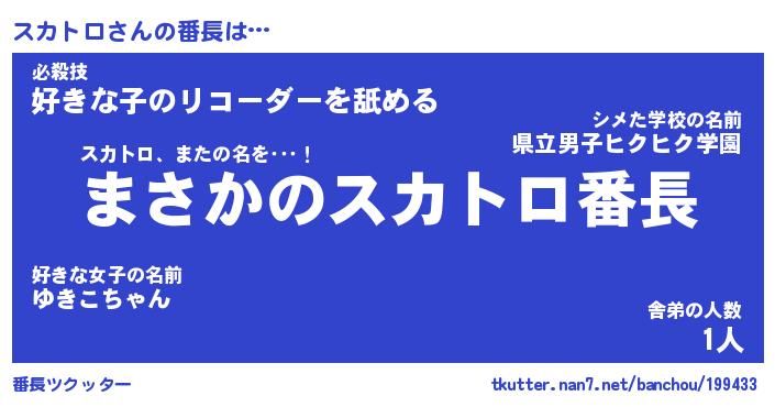| ヒーロー風カッコイイあだ名 | 『スーパースカトロ』『黄金騎士スカ』 |