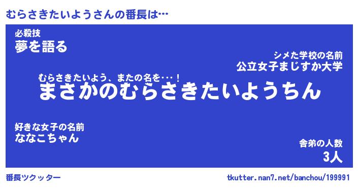 | 男性向けラノベタイトル風あだ名 | 『むらさきたいようの憂鬱』 |
