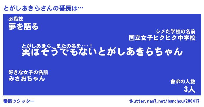 | 肩書あだ名 | 『とがしあきらCEO』『とがしあきら大統領』 |