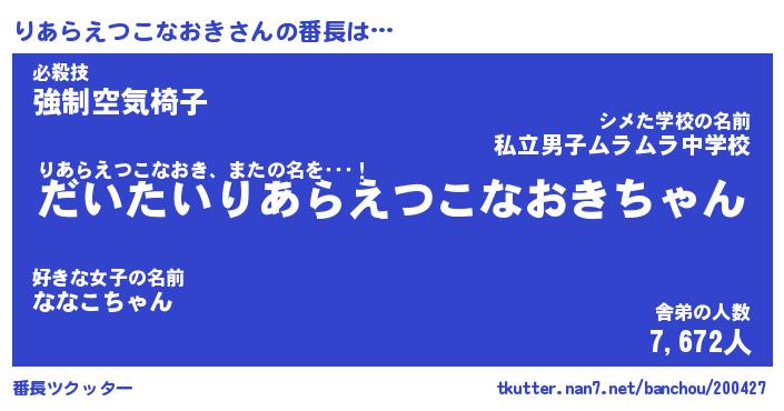 | 肩書あだ名 | 『りあらえつこなおき店長』 |