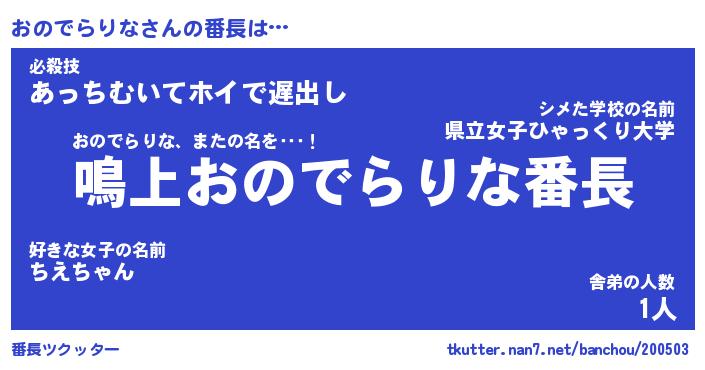 | 伝説のあだ名 | 『封印されしスナイパーおのでらりな』 |