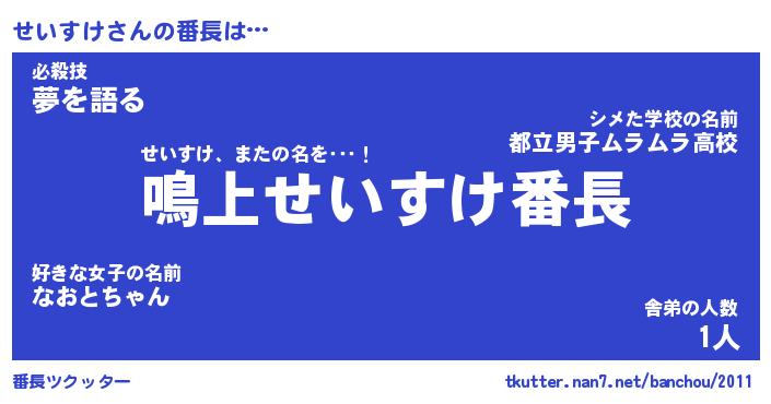 | 肩書あだ名 | 『せいすけ社長』『せいすけ総理大臣』 |