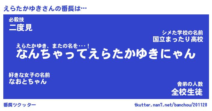 | ヒーロー風カッコイイあだ名 | 『スーパーエラタカユキ』『暗黒騎士エラ』 |