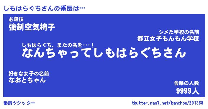 | 男性向けラノベタイトル風あだ名 | 『しもはらぐちの憂鬱』 |