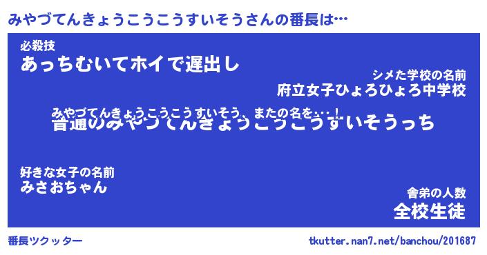 | ヒーロー風カッコイイあだ名 | 『スーパーミヤヅテンキョウコウコウスイソウ』 |
