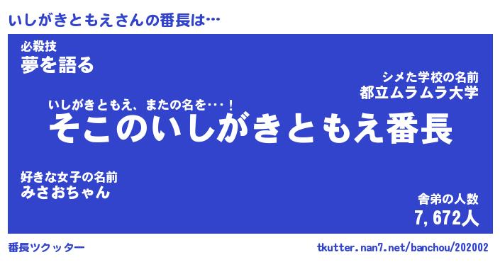 | ヘコむあだ名 | 『いしもー』『豆乳』『いし太郎』 |