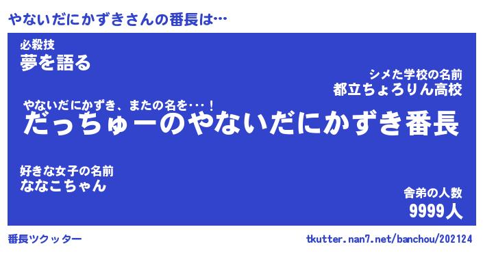 | 男性向けラノベタイトル風あだ名 | 『やないだにかずきの憂鬱』 |