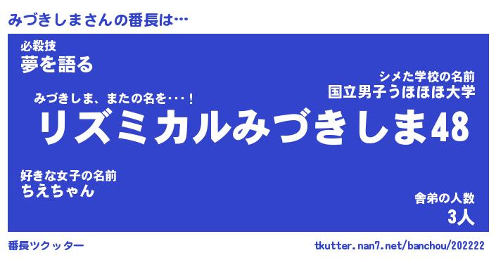 | 肩書あだ名 | 『みづきしま御曹司』『みづきしま大統領』 |