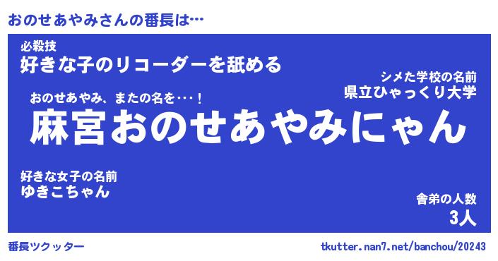 | 伝説のあだ名 | 『不死鳥のスナイパーおのせあやみ』 |
