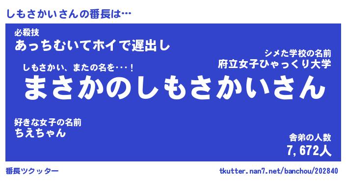 | 男性向けラノベタイトル風あだ名 | 『しもさかいの憂鬱』 |