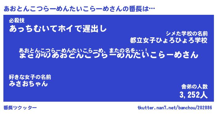 | ヒーロー風カッコイイあだ名 | 『スーパーアオトンコツラーメンタイコラーメ』 |