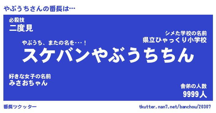 | ヒーロー風カッコイイあだ名 | 『スーパーヤブウチ』『炎刃騎士ヤブ』 |