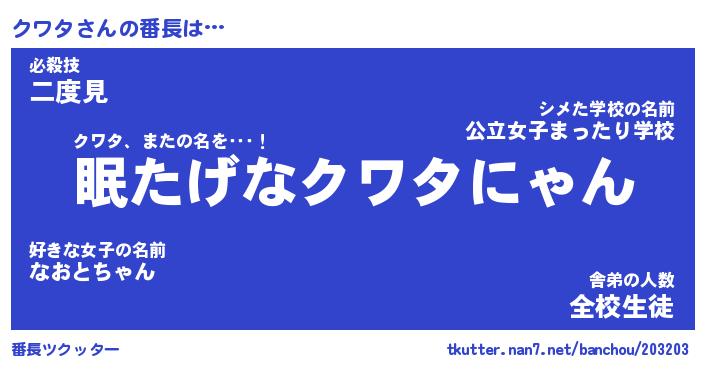 | ヒーロー風カッコイイあだ名 | 『スーパークワタ』『ウルトラクワタマン』 |