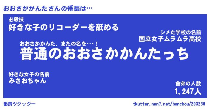| 肩書あだ名 | 『おおさかかんた御曹司』 |