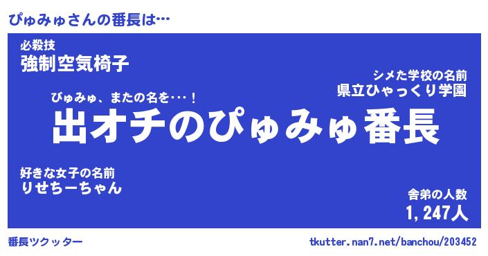 | 肩書あだ名 | 『ぴゅみゅ社長』『ぴゅみゅ国家主席』 |