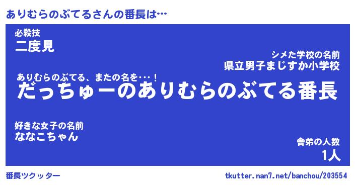 | 伝説のあだ名 | 『伝説のスナイパーありむらのぶてる』 |