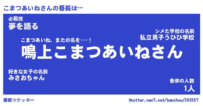 | ツイッター | こまつあいねさんのツイッターID『dendenmushi_idle』 |
