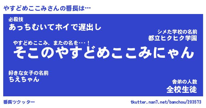男性向けラノベタイトル風あだ名 | 『やすどめここみの憂鬱』 |