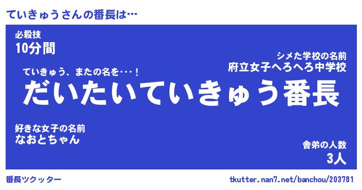 | 肩書あだ名 | 『ていきゅう御曹司』『ていきゅう班長』 |