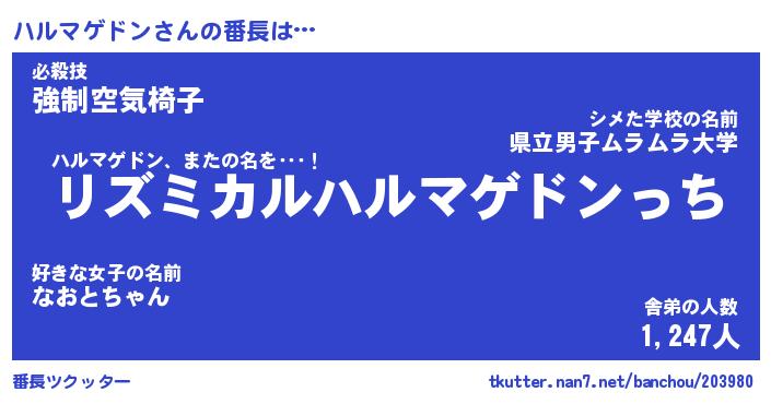 | 男性向けラノベタイトル風あだ名 | 『ハルマゲドンの憂鬱』 |