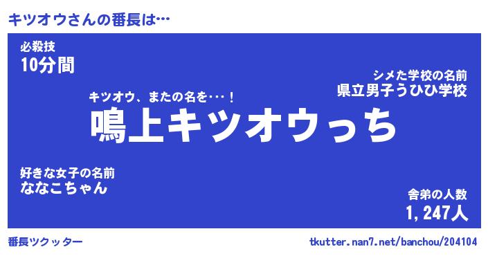 | 意味不明あだ名 | 『ペロリンキツオウ』『永久保存キツオウ』 |