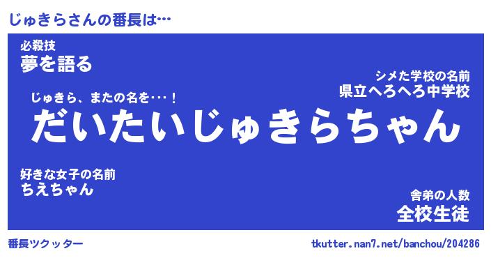 | 欧米人風あだ名 | 『マイケルじゅきら』『ウサインじゅきら』 |