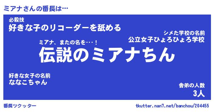| 意味不明あだ名 | 『ペロリンミアナ』『ミアナフォーエバー』 |