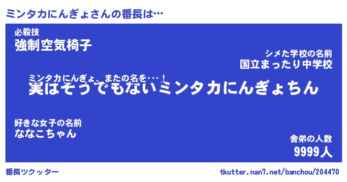| ヒーロー風カッコイイあだ名 | 『スーパーミンタカニンギョ』 |