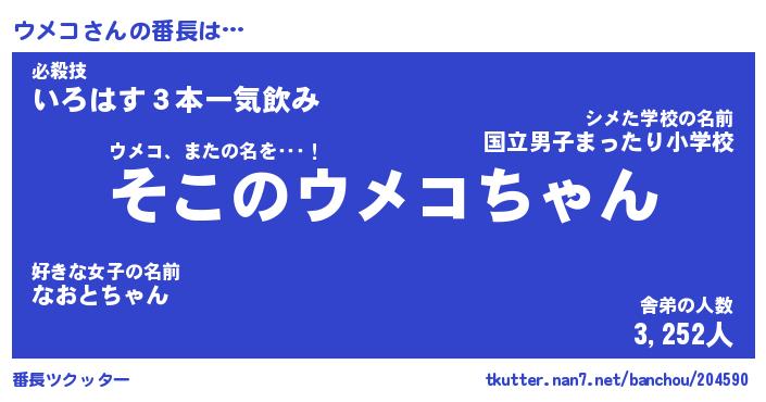 | ヒーロー風カッコイイあだ名 | 『スーパーウメコ』『ウルトラウメコマン』 |