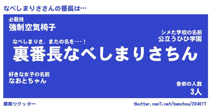 | 伝説のあだ名 | 『不死鳥のスナイパーなべしまりさ』 |