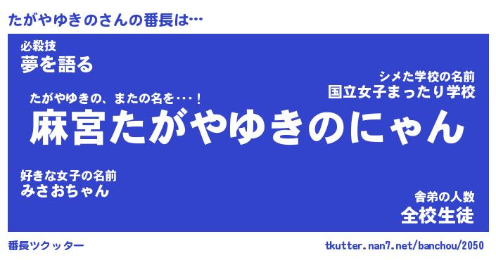 ヘコむあだ名 | 『たがもー』『なまこ酢』『たがを』 |