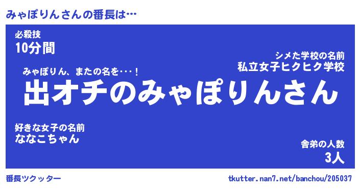 | 男性向けラノベタイトル風あだ名 | 『みゃぽりんの憂鬱』 |