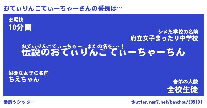 | 女子向けラノベタイトル風あだ名 | 『(仮)おてぃりんこてぃーちゃーのやんごとなき事情』 |